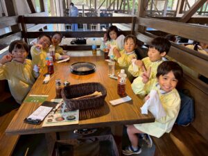 沢山体を動かしてお腹もペコペコになった子ども達。クンクン、、🐽なんだかいい匂いがしてきたな。次はお待ちかねのバーベキュー🍖
