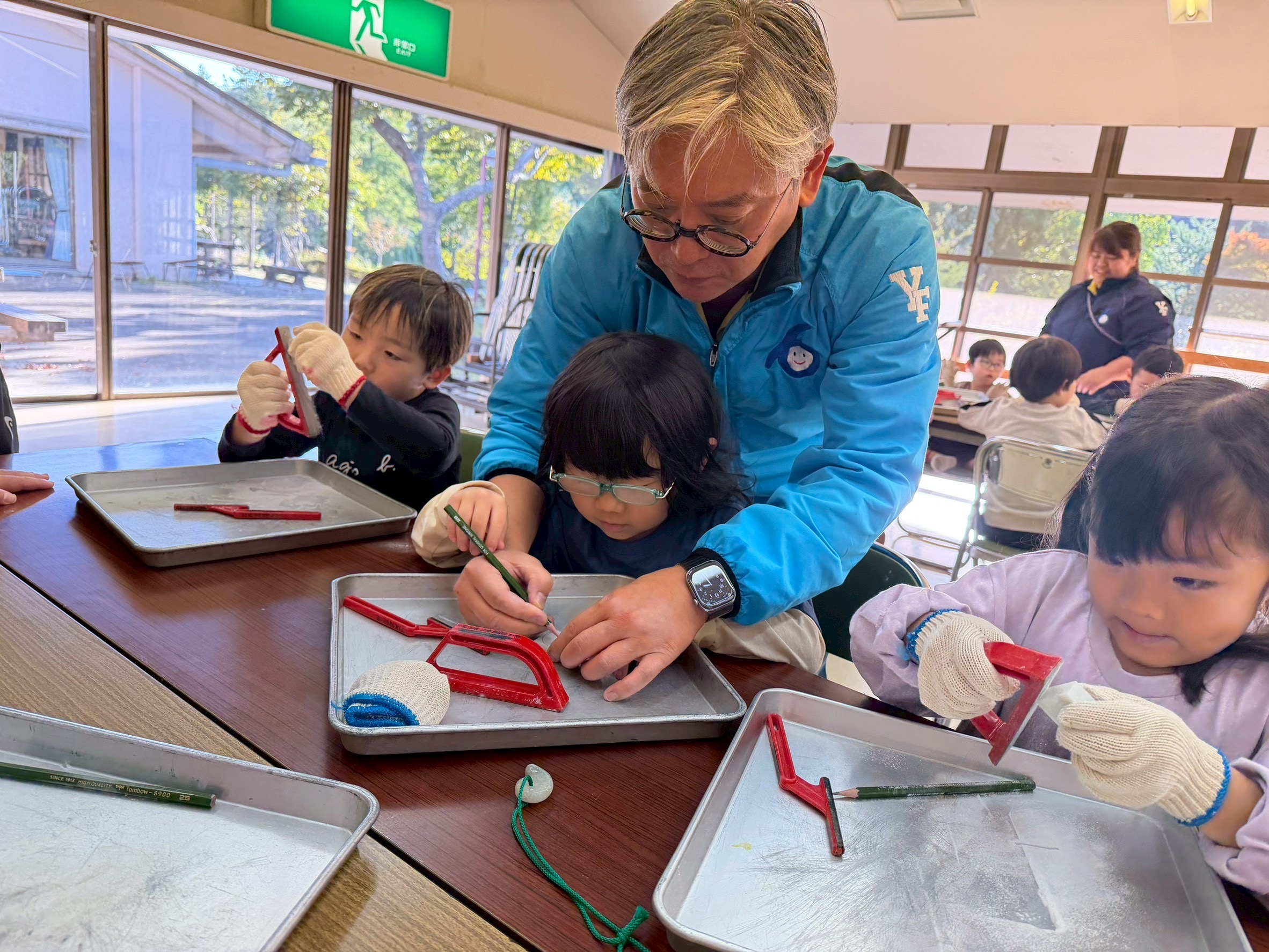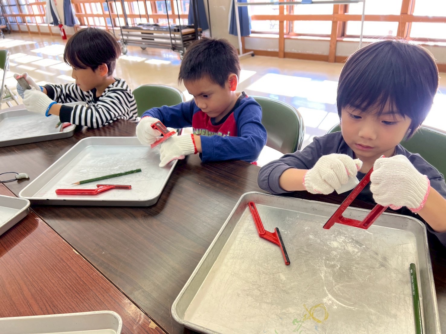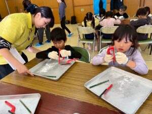 すもすクラスさん達は、力いっぱい無我夢中で削っていました💦^^。途中は、「難しい~」「これ完成しやん~」と、弱気になる子ども達も、、。