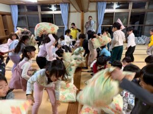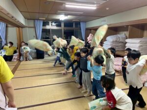 施設に帰ってきてからは、子ども達が楽しみにしていた枕投げ!!男女にチーム分けをして、負けられない戦いが開幕🔥