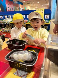 牛肉やタコス、パイナップルを2つ、牛乳に卵などいろんなものを買ってお家の人の体験ができました🥬他にも郵便屋さんや工事現場の人、ケーキ屋さん、たこ焼き屋さんなど職業体験ができ大喜びの子ども達。「いらっしゃいませ~どうですか~」とお店屋さんになりきるのが上手でした。