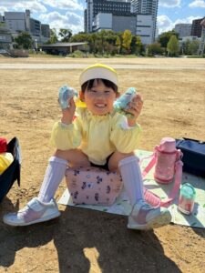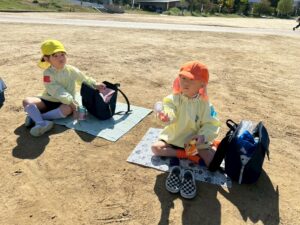 ひとつの円になりお家の人が作ってくれたおにぎりを「美味しい~」「こんなおにぎり作ってくれたの~」と見せてくれながらポカポカお日さまの下で食べました😊今人気のキャラクターや中にから揚げ、ミートボールが入っていたり、ふりかけがかかっていたり、美味しそうなおにぎりがいっぱい😋