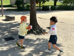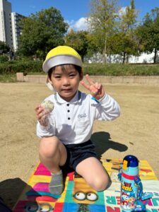 朝は隣にある扇町公園で今日一緒に遊ぶお友だちと「よろしくね~」と挨拶をし、2つのグループに分かれ公園内を散策しました。