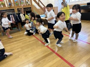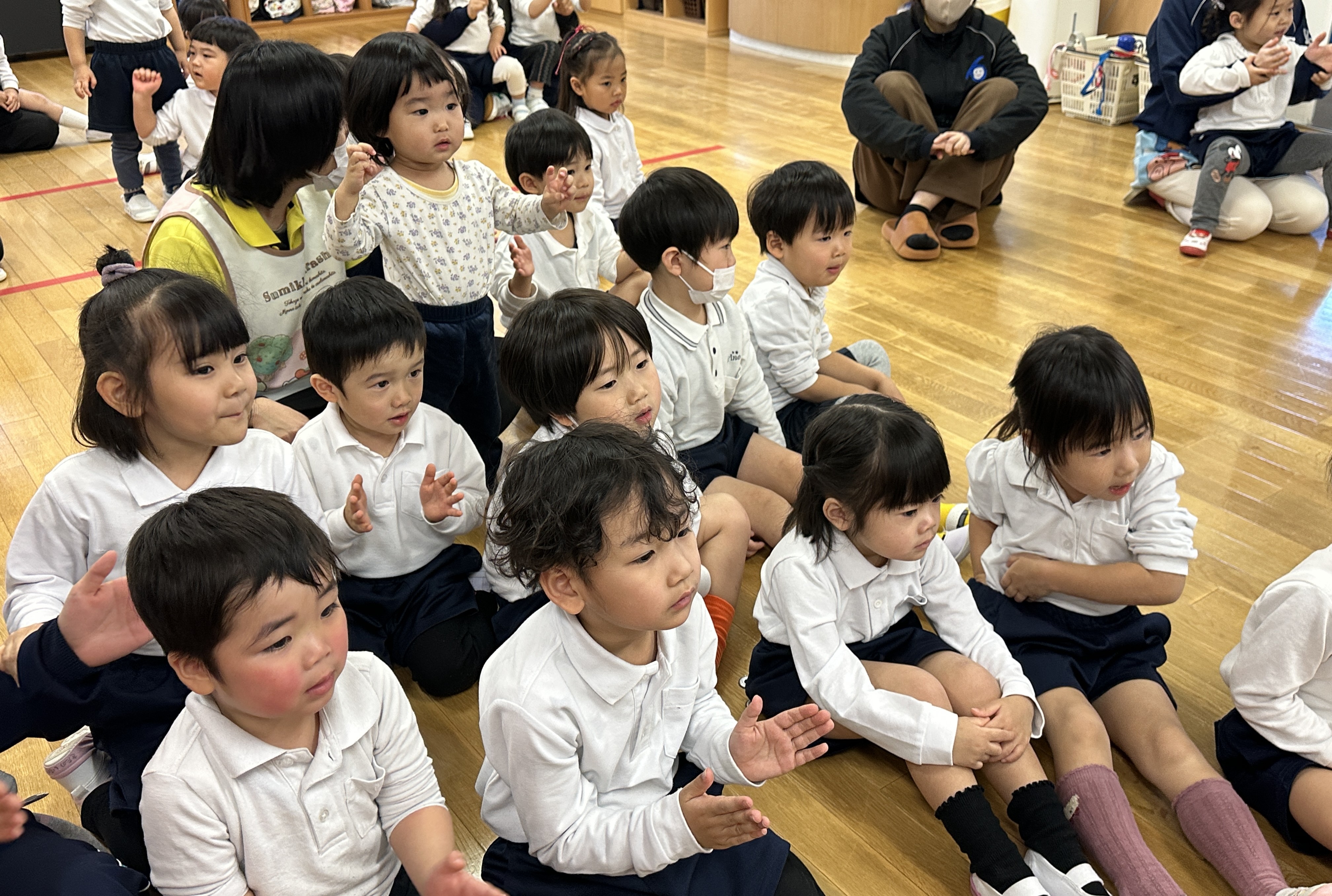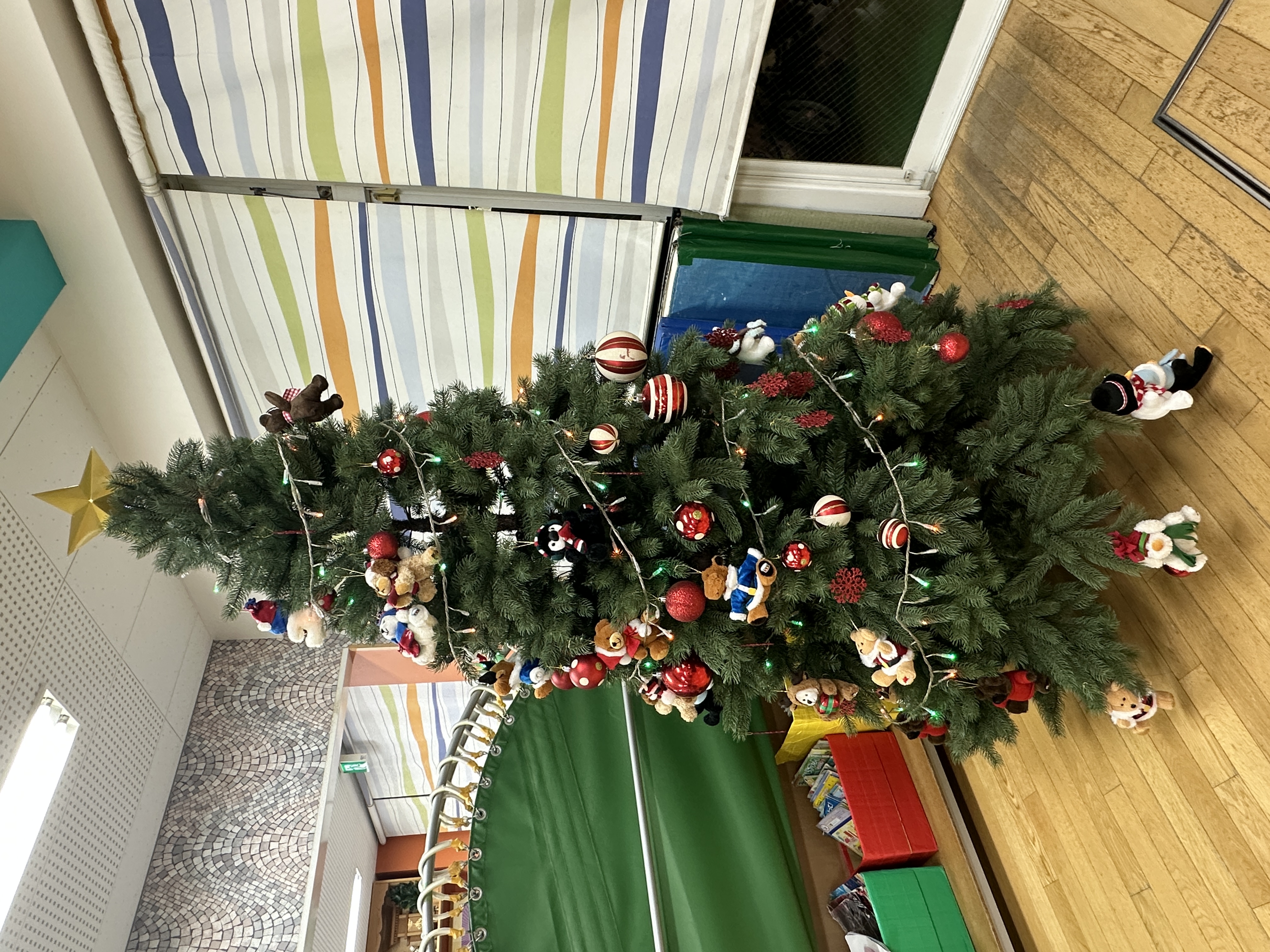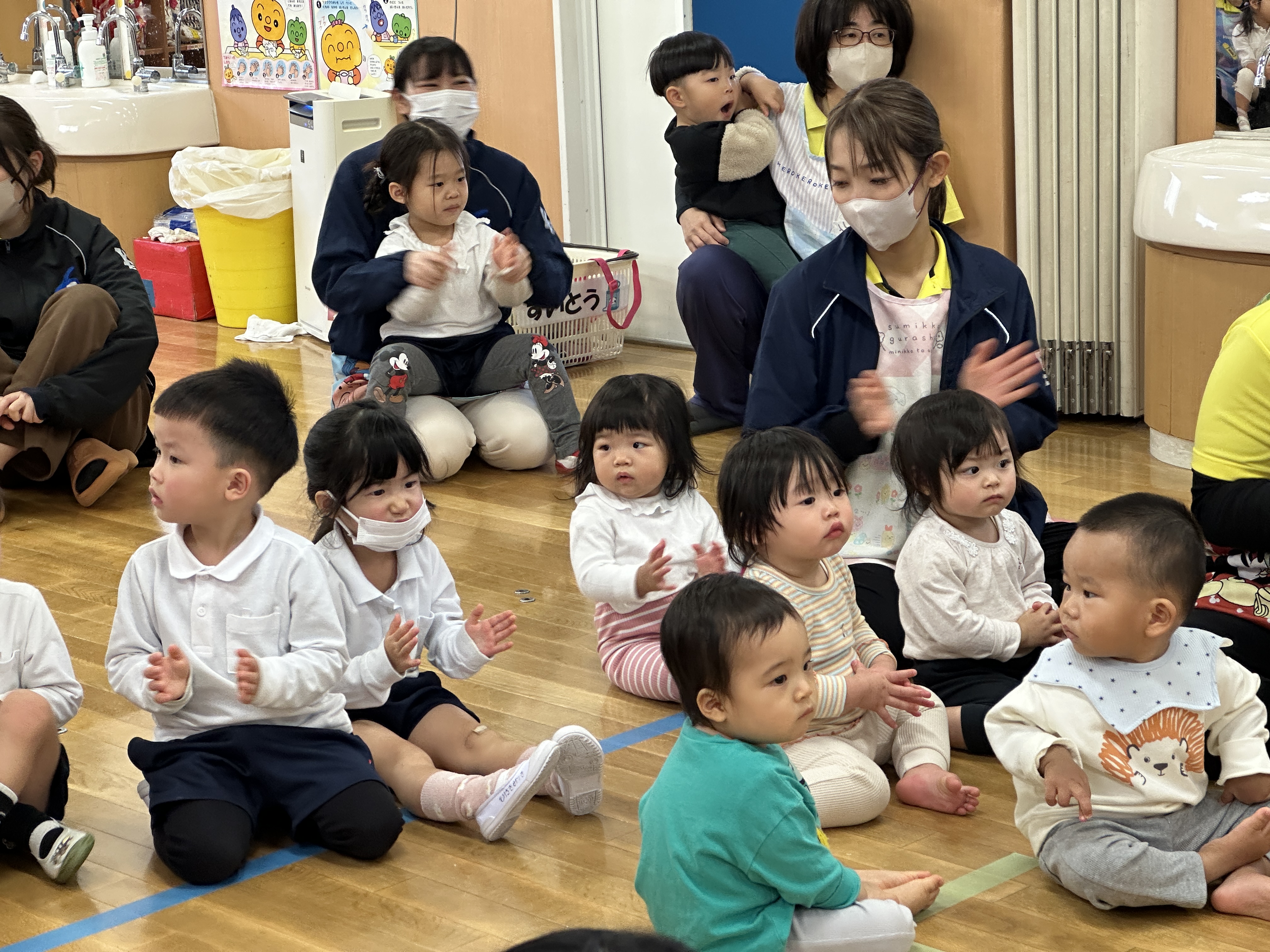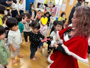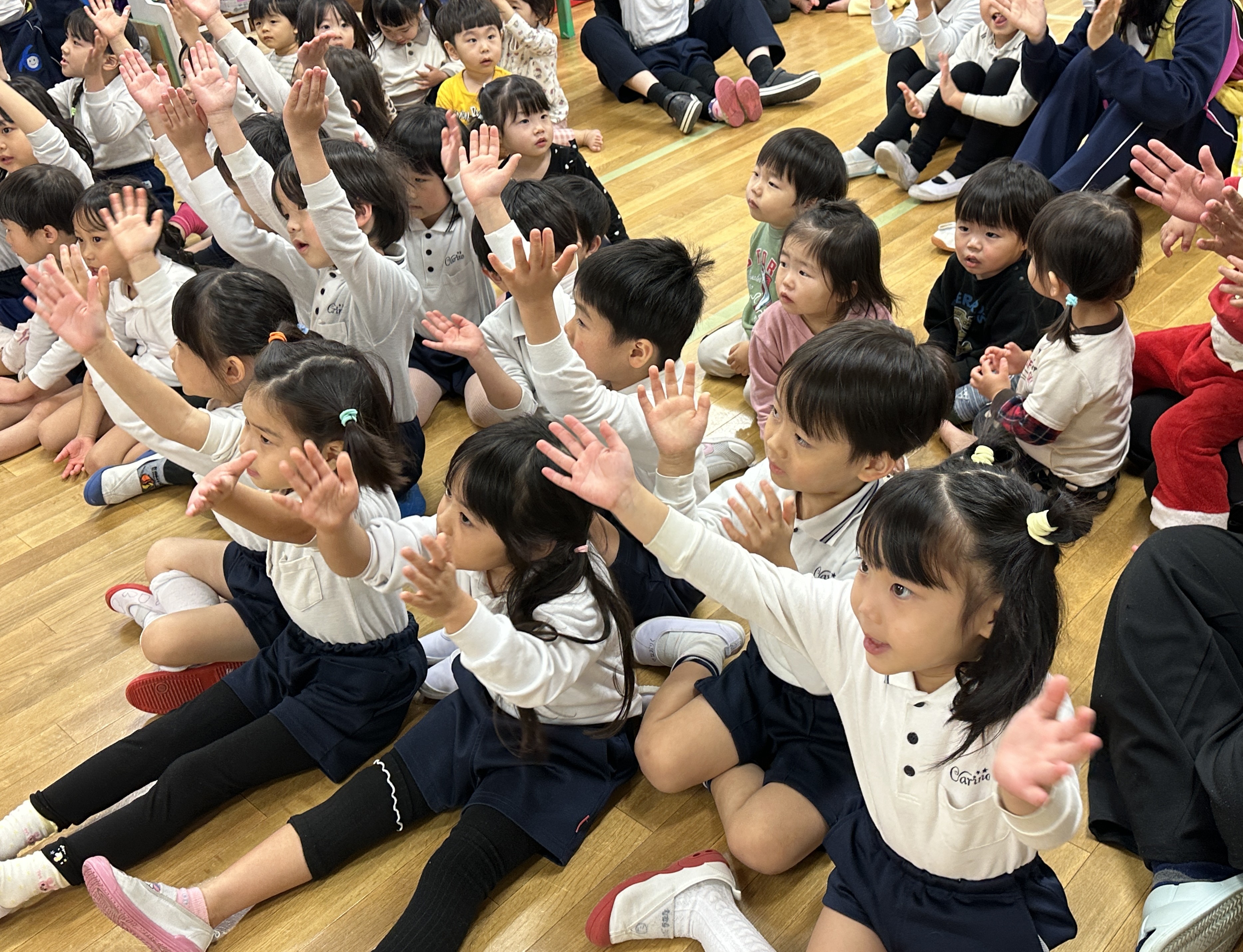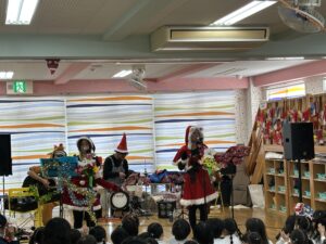 保育園にクリスマスツリーやトナカイが登場してクリスマスモードになってきたところで、ロック ア ゴーゴージュの皆さんによるクリスマスコンサート🎵がありました。🎵にじのむこうにから始まって、はたらくくるま、おもちゃのチャチャチャやジングルベル、あわてんぼうのサンタクロースなどのクリスマスソング歌ってもらいました。🎵レッツゴー!🎵あたまかたひざぽん、みんな大好き🎵しゅりけん忍者では新しい技も加わり歌って踊って大盛り上がりでした。5歳児クラスはお休みが多く3人の参加となりましたが、リクエストした🎵ゆめびよりをみんなの前で披露しました。アンコールは🎵夢をかなえてドラえもん。最後はかわいいプレゼントもいただいて、大満足の1時間でした☺