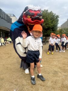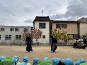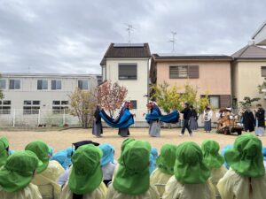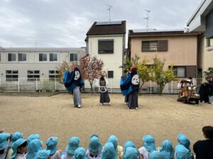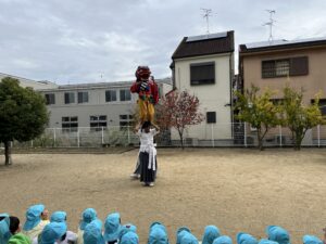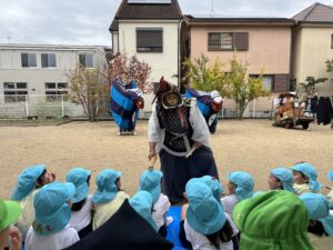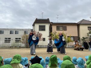 雨が上がって少し肌寒い園庭に装束を着た見慣れない人たちが・・・。実はこの方たちは三重県から来てくださった【伊勢太神楽】という獅子舞等の伝統芸能をされている山本源太夫の皆さん。