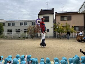 松原カリーノ保育園では通称ししまいの方々です。あごの上に棒をのせる演技では何でもできるおじさん2人で進行。この道化のおじさんがとにかく面白く、みんな大爆笑!