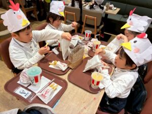 セブンパークに着くとチームに分かれてさっそく店内へ。あらかじめ作っておいたニワトリの帽子を被り、それぞれいただきます。ニワトリの帽子を被りつつニワトリのお肉であるチキンをほおばるちょっとシュールな感じ。それでも周りにいたお客さんからは「かわいい・・・」という声が。