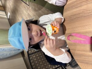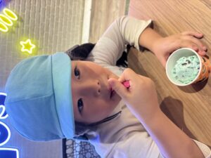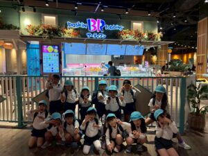 さあ帰ろうかと思っていたら「今からサーティーワンに行きます」と。当然大喜びでメニューを見ながら悩みに悩んで好きなものを一つ選び、アイスが届くと満足顔であっという間にカップの中はなくなりました。園に戻ると理事長先生が「今日いろいろと楽しいことがあったのは、みんなが運動会を頑張ったご褒美です」と。しっかりお礼を言ってほくほく顔でお部屋に戻りました。