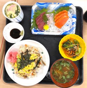昼食は、ちらし寿司・お造り3種盛り・茶碗蒸し・