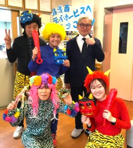 皆様には赤鬼・青鬼・福の神・馬のお面をつけて頂きました!